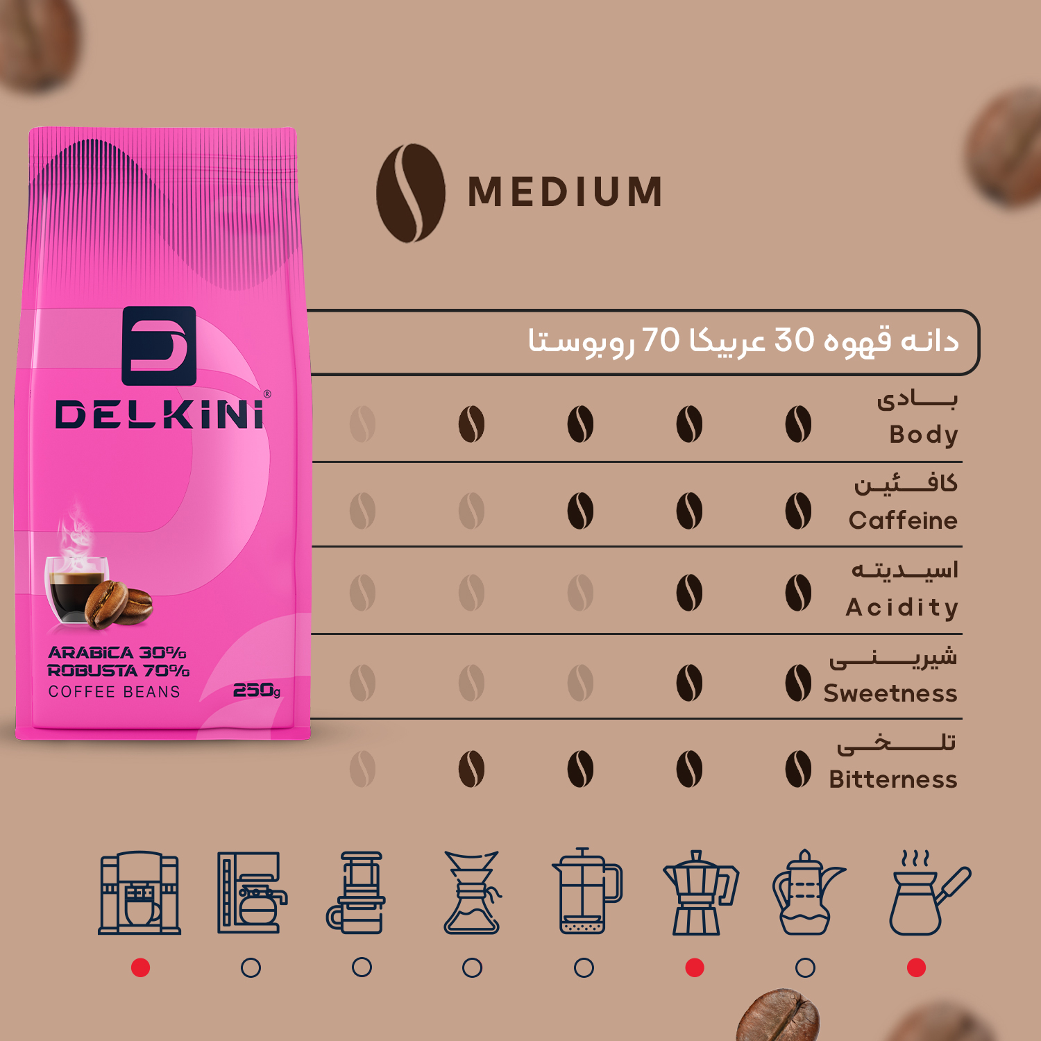 دانه قهوه /70% روبوستا، 30% عربیکا/ مدیوم روست/ طعم نسبتا تلخ/ کافئین نسبتا زیاد /مناسب برای همه ابزارهای دم آوری
