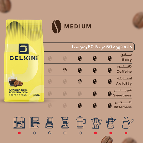 قهوه 50 % عربیکا و 50 % روبوستا دلکینی با ردپای قدرتمند روبوستا در هر فنجان، تجربهای به یادماندنی را نوید میدهد. تلخی نسبتا بالایی دارد و شیرینی ملایمی در آن پنهان شده است. این قهوه با اسیدیته ملایم و کافئین نسبتا بالایی همراه است. وجود 50 درصد روبوستا در این ترکیب، بدنهای قدرتمند به این قهوه میبخشد؛ بنابراین کرمایی زیبا و دلنشین، همچون تاجی بر فنجان شما، زیبایی و عمق طعم آن را دوچندان میکند.